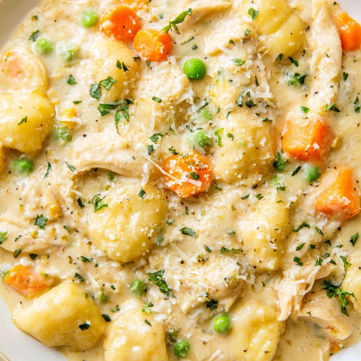 - Add the uncooked gnocchi, cooked chicken, and frozen peas, stirring gently so the gnocchi is mostly submerged in the sauce